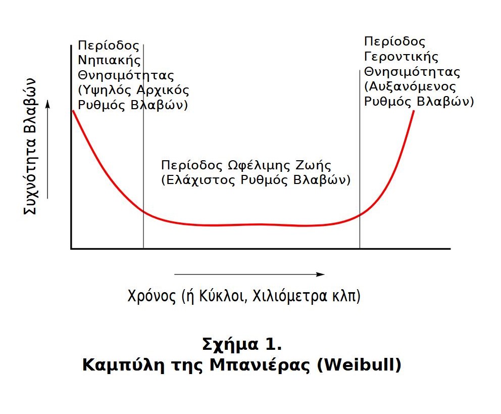 Η συχνότητα βλαβών. Η συχνότητα βλαβών των στοιχείων μιας μηχανής ή ενός μηχανισμού, ή και η συχνότητα βλαβών ενός ολόκληρου μηχανολογικού συστήματος, έχει βρεθεί από χιλιάδες χιλιάδων πειράματα, ότι ακολουθεί ένα συγκεκριμένο μοτίβο, παρόμοιο σε κάθε περίπτωση. Το μοτίβο αυτό έχει ως εξής : Πολλές βλάβες εμφανίζονται στην έναρξη της επιχειρησιακής ζωής των μηχανημάτων, στην συνέχεια παρατηρείται μία μακρά περίοδος ηρεμίας όπου οι βλάβες είναι τυχαίες και ελάχιστες, και τέλος, πάλι παρουσιάζεται μία έξαρση των βλαβών στο τέλος της χρήσιμης επιχειρησιακής λειτουργίας τους. Το μοτίβο αυτό παρουσιάζεται σχηματικά (Σχήμα 1) παρακάτω, όπου και σημειώνονται καθαρά οι τρείς χαρακτηριστικές αυτές περίοδοι. Η καμπύλη ονομάζεται “η καμπύλη της μπανιέρας” λόγω του σχήματός της, ή του Weibull, από τον μαθηματικό που κυρίως την ανέλυσε.